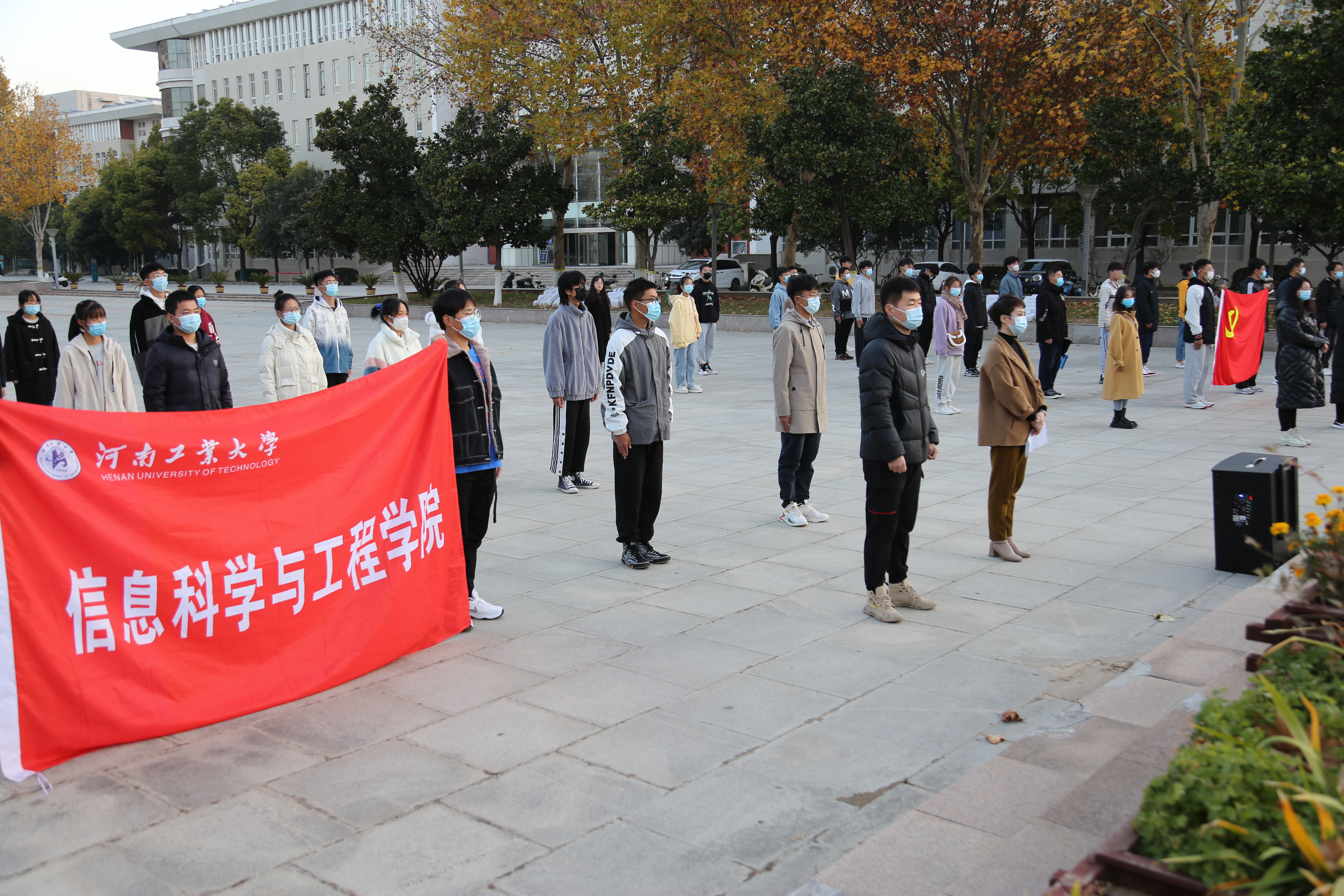 升旗仪式开始,伴随着雄壮的国歌声,五星红旗在朝阳中冉冉升起,在场师生庄严肃立,高唱国歌,向伟大祖国致敬。深情的歌声里激荡着信息学子的爱国热情,飘扬的国旗中彰显着时代青年的使命担当。