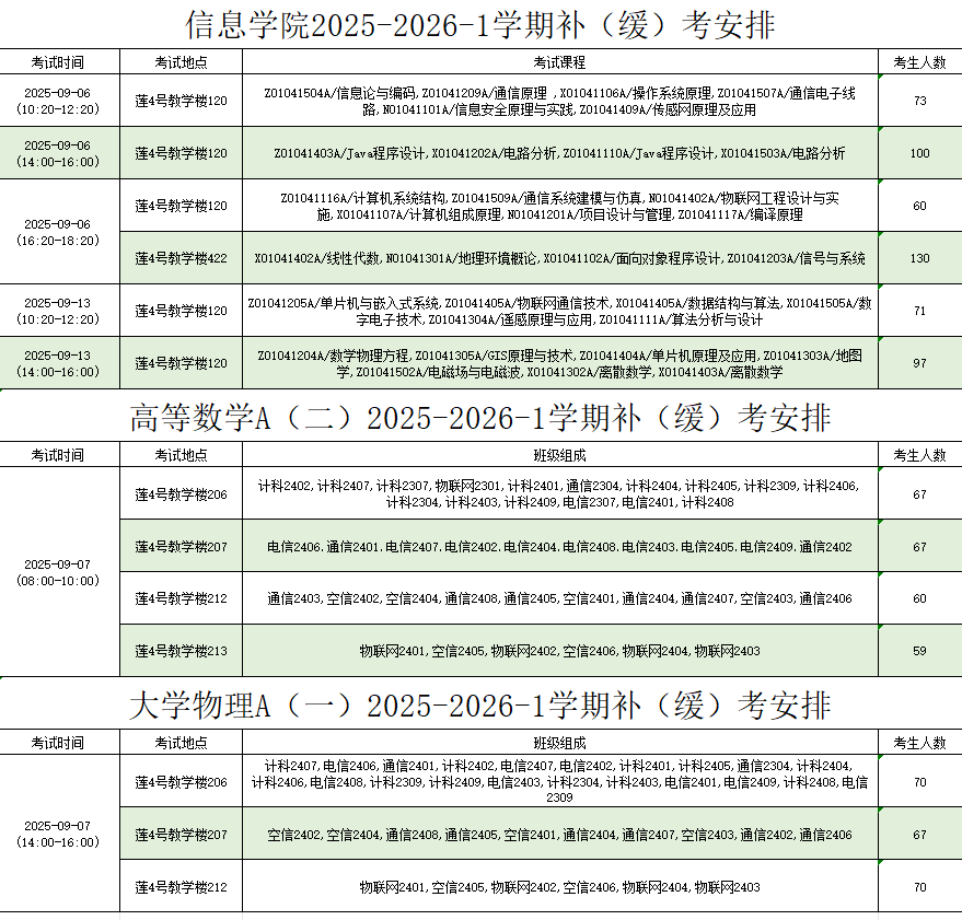 根据本学期教务处补(缓)考总体安排,2025-2026-1学期的补(缓)考安排已上传学校教务系统,请各位考生及时进入教务系统查看具体考试安排。请考生务必携带身份证和学生证(或一卡通)参加考试。