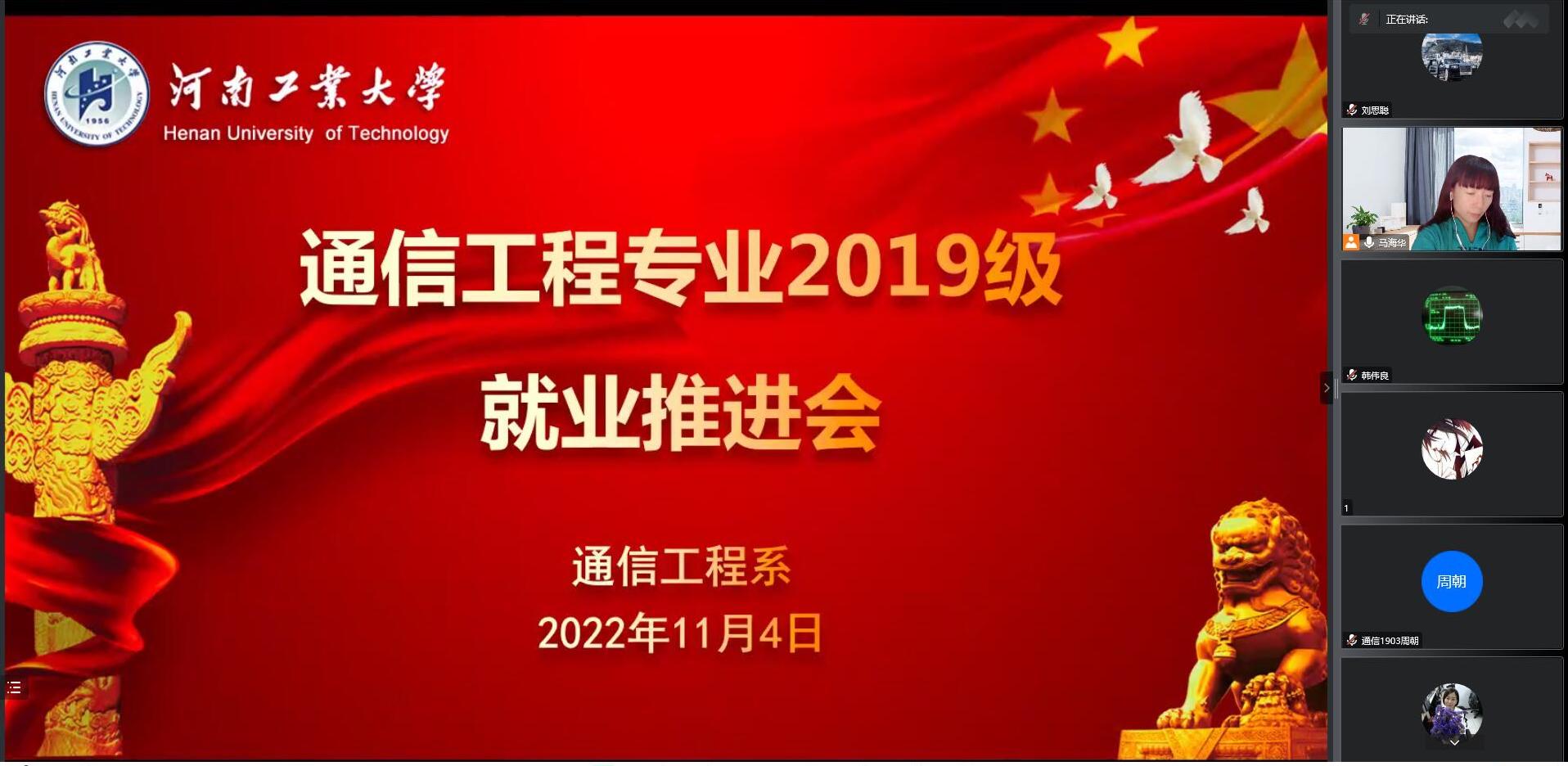 为进一步推进通信工程专业2019级学生就业工作,帮助广大学生树立正确的就业观念,11月4日,通信工程系召开线上就业推进会。通信工程系副主任韩伟良、辅导员刘思聪、班主任赵攀以及通信工程专业2019级全体学生参加了会议,会议由通信工程系主任马海华主持。
