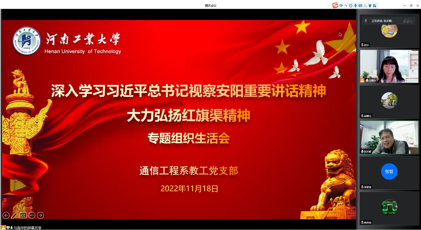 为深入学习贯彻党的二十大精神和习近平总书记视察河南安阳重要讲话精神, 11月18日,通信工程系教工党支部开展“深入学习习近平总书记视察安阳重要讲话精神,大力弘扬红旗渠精神”为主题的专题组织生活会。支部全体党员通过腾讯会议参加了本次学习活动,会议由通信工程系党支部书记马海华主持。正妹av