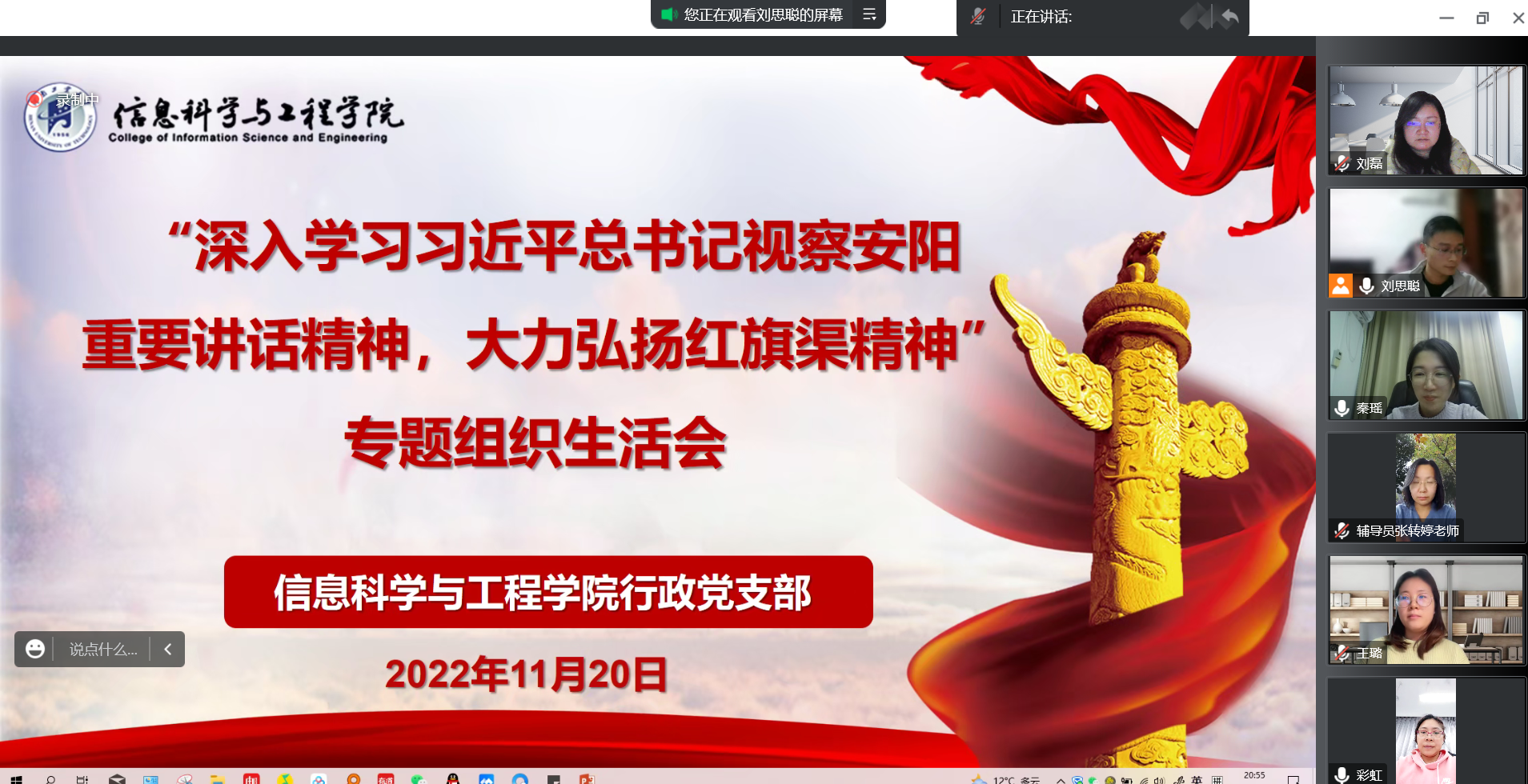 会上,支部全体党员观看《习近平总书记考察红旗渠纪实》和《根脉——红旗渠精神》学习视频,深刻领会红旗渠精神的丰富内涵和时代价值,弘扬红旗渠精神,赓续红色血脉。接着,秦瑶领学了“习近平总书记视察陕西延安和河南安阳重要讲话精神”,她指出,要将学习贯彻“习近平总书记视察陕西延安和河南安阳重要讲话精神”与党的二十大精神作为当前和今后一段时期的重要政治任务,从中汲取信仰信念的力量,坚定不移对党绝对忠诚、强化理论武装、传承红色基因,在继承弘扬中守正创新,以实际行动衷心拥护“两个确立”、忠诚践行“两个维护”。随后,她对学校“12357新时代筑峰工程”和内涵发展“八大战略”进行了深刻的阐述,强调要紧跟学校政策和时代步伐,发挥共产党员先锋模范作用,把力量凝聚到党的二十大确定的各项任务上来,为学校“双一流”建设作出应有贡献。
