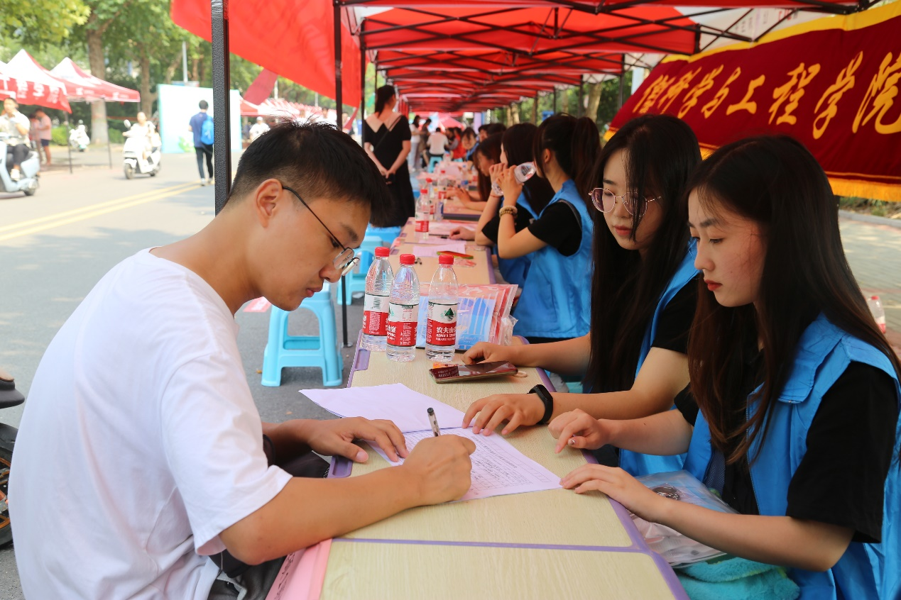 迎新大本营设在学生公寓A区附近,主要由学生会主席和数名志愿者负责本次迎新的相关事宜,主要包括会场的布置、办理报到注册手续、审查新生材料、发放材料等。新生报到现场高挂着迎新横幅,工作进行得有声有色。在本次迎新工作中,志愿者们热情接待每一位学生家长,与报到的学生及家长们交流,对新生报到中遇到的疑问进行耐心地讲解,抓好新生入学的绿色通道工作,不让每一个家庭困难的学生因为经济困难而无法入学;为了做好新生的专业介绍工作,迎新点还专门设立了多个新生咨询处;志愿者们积极配合,做好接待工作,安排各项细节,维持整个现场的秩序;迎新活动进行得如火如荼、井井有条,2023级研究生新生秩序井然地排队注册、咨询,工作人员热情耐心。