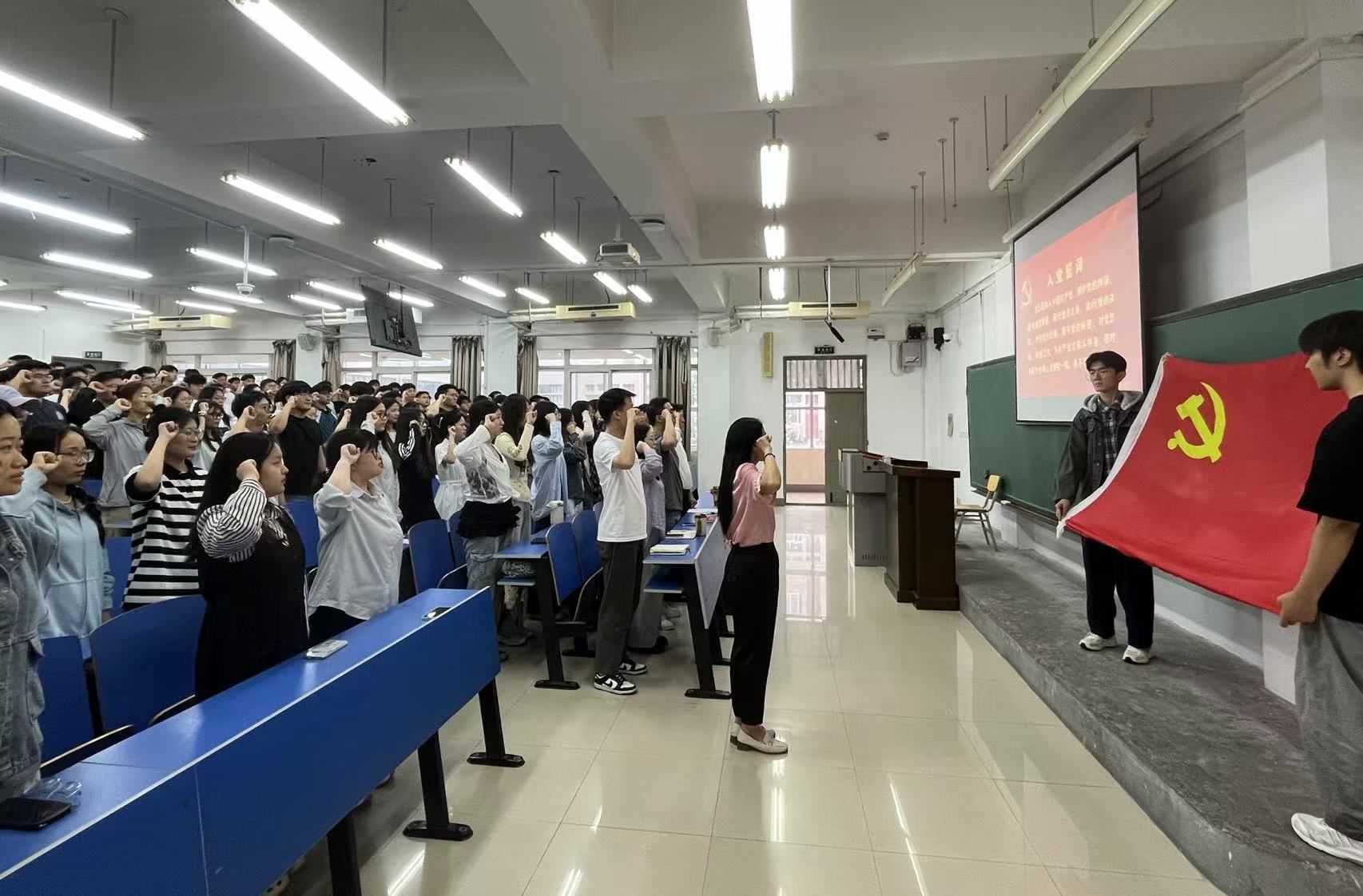 党课正式开始前,在魏雪芹的领誓下,全体党员重温入党誓词。铿锵有力的誓言回荡在会场,全体毕业生党员进一步强化了责任意识与使命担当。