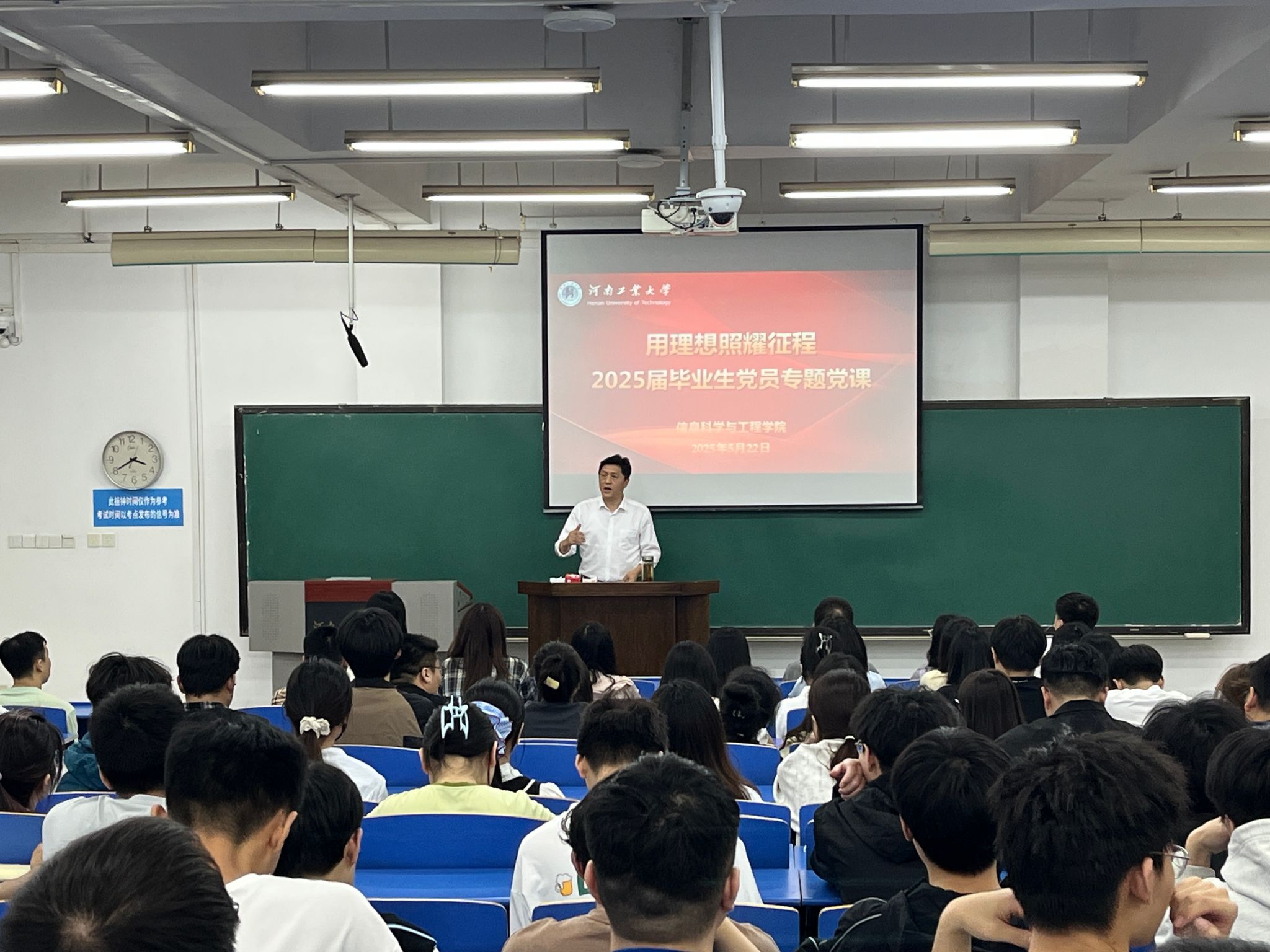 党委书记郭晓旻以“用理想照耀征程”为题,为2025届全体毕业生党员讲授专题党课,教育引导毕业生党员永葆初心、锻炼党性、担当使命。学院党委副书记魏雪芹主持本次党课,全体辅导员及毕业生党员共同参与。