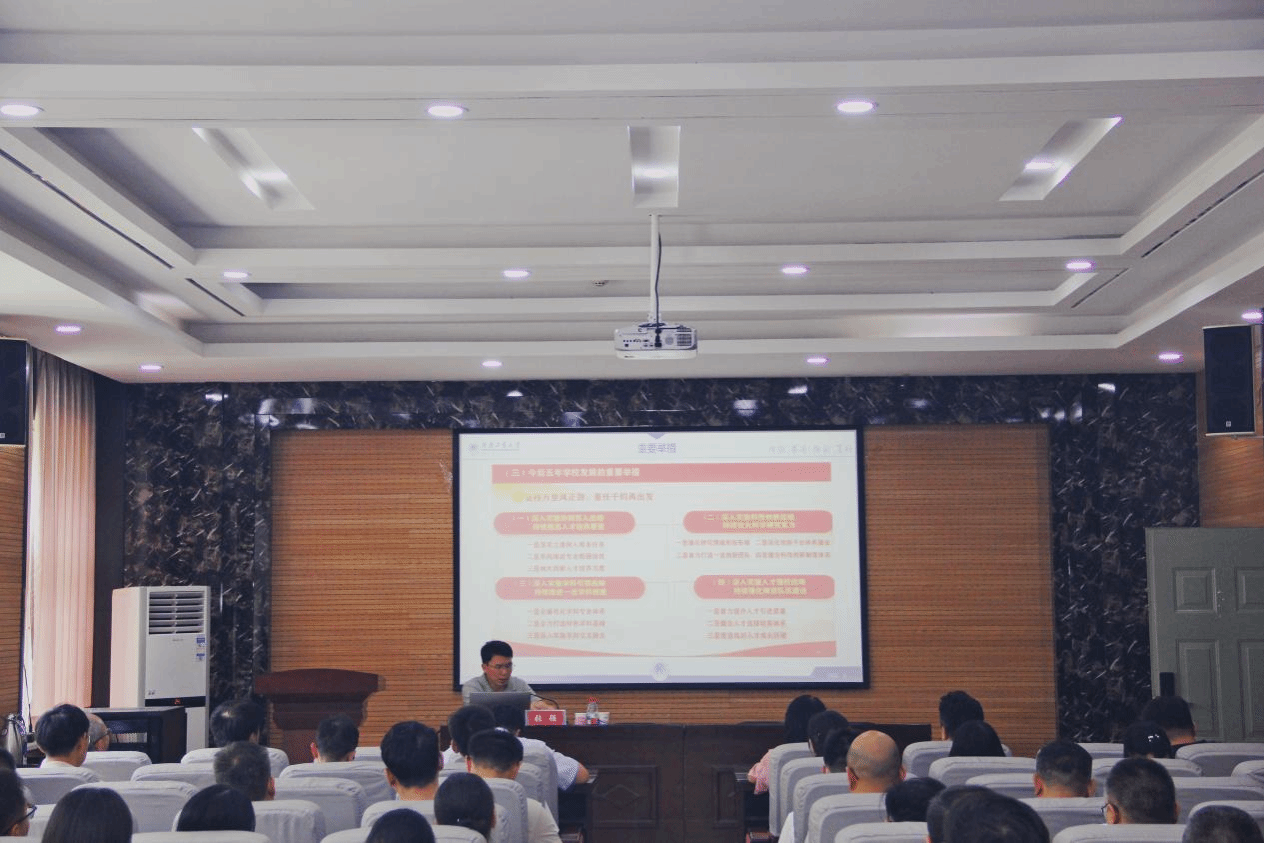 张强以“全面深化改革,理顺体制机制”为主题,围绕人事制度改革的重点方向展开宣讲。他首先从《岗位聘任与任务考核工作方案》、《绩效工资实施方案》及《关于加强和改进专业技术人员职称评聘工作的意见》三个新修订的重要文件入手,深入解读文件出台的背景与意义。他指出,这些制度的修订是学校核心管理体系不断健全、完善的重要体现,更是支撑学校从应用型人才培养向学术型转变、服务“双一流”创建的重要举措。张强进一步介绍了学校人事人才相关工作的重点安排和战略导向。他明确提出,要以“转作风、树形象、抓重点、解难题”为工作方针,高质量推进人事管理与服务各项任务。此外,他还重点介绍了人事处在师德师风建设方面的工作举措,围绕“两个必须”、“三个不得”及“五心做事”等具体内容,阐述了在作风转变、服务提升方面的努力和成效。