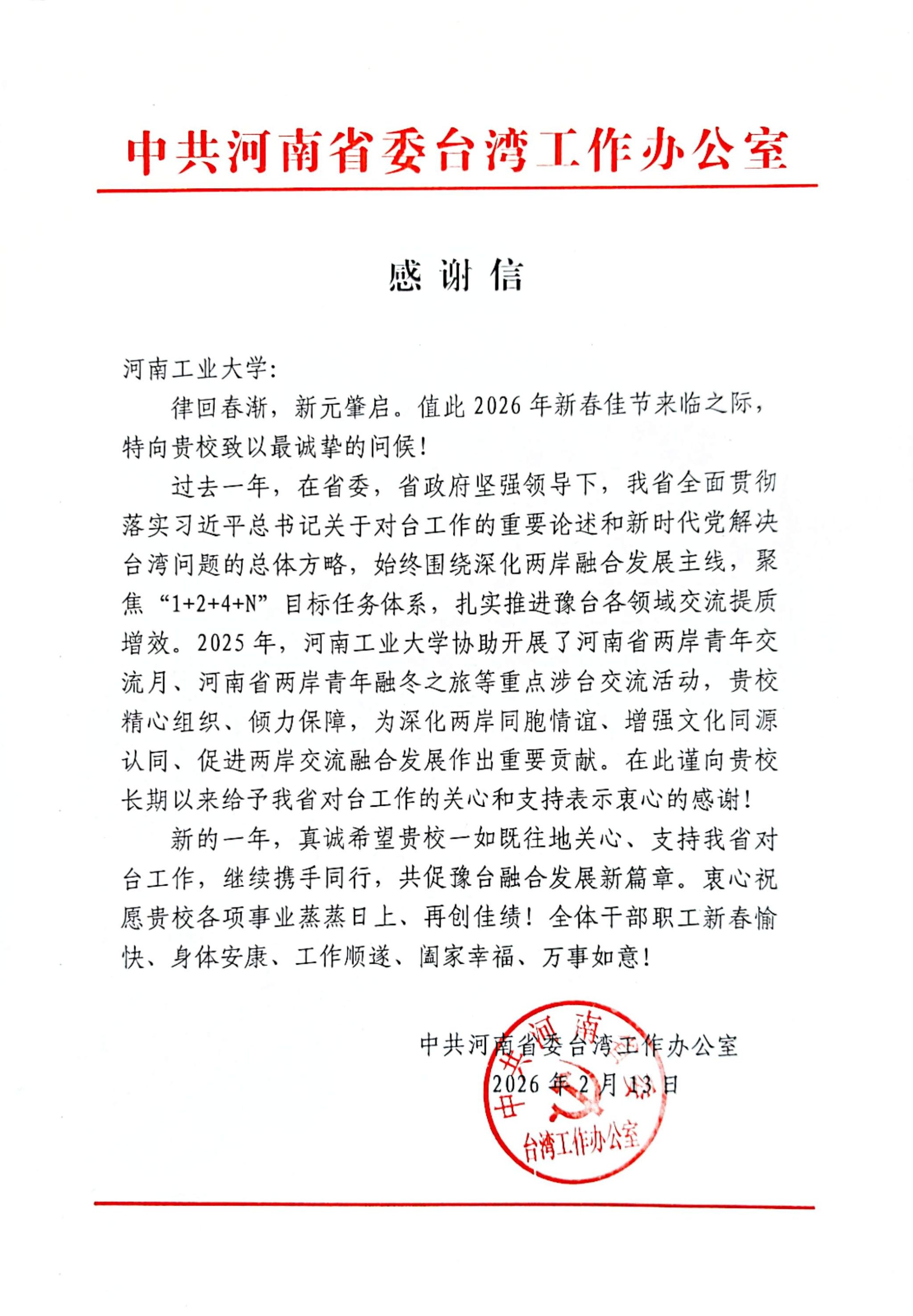 近日,中共河南省委台湾工作办公室向我校发来感谢信,对学校在协助开展重点涉台交流活动作出的积极贡献表示衷心感谢。
