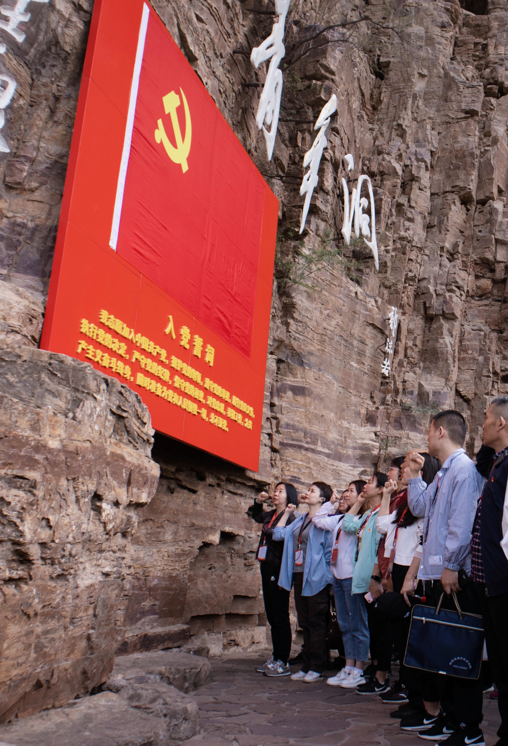 在红旗渠咽喉工程--青年洞前,周芳带领全体成员重温入党誓词、近距离领略了林州人民不畏艰险、仅靠一锤一铲一双手让林州大地换新颜的艰苦奋斗精神。