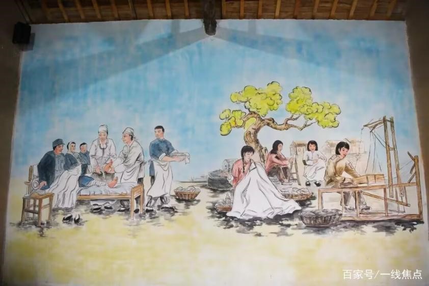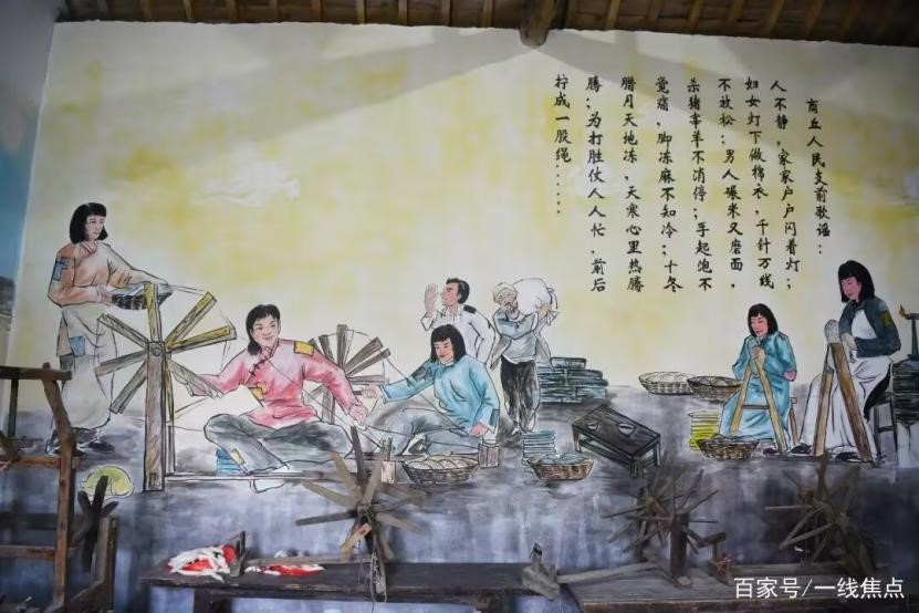 随后,团队成员走进旁边的小屋,先看到的就是墙上的壁画,此处描绘了一幅大后方百姓为前线供给战略物资的情形,右上角还有一首商丘人民支前歌谣:“人不静,家家户户闪着灯;妇女灯下做棉衣,千针万线不放松;男人碾米又磨面,杀猪宰羊不消停;手起泡不觉痛,脚冻麻不知冷;十冬腊月天地冻,天寒心里热腾腾;为打胜仗人人忙,前后拧成一股绳……”。从这幅壁画就看到当时的后方人员为了胜利,大家劲都往一处使,团结凝聚成一股绳,只为能给前线人员提供最充足的保障。此外,小屋的另一面墙上又是一幅壁画,画面上是当地医护人员和百姓救助伤员的情形,百姓的勤劳赤诚以及伤员恢复的喜悦在画面中都得以体现。