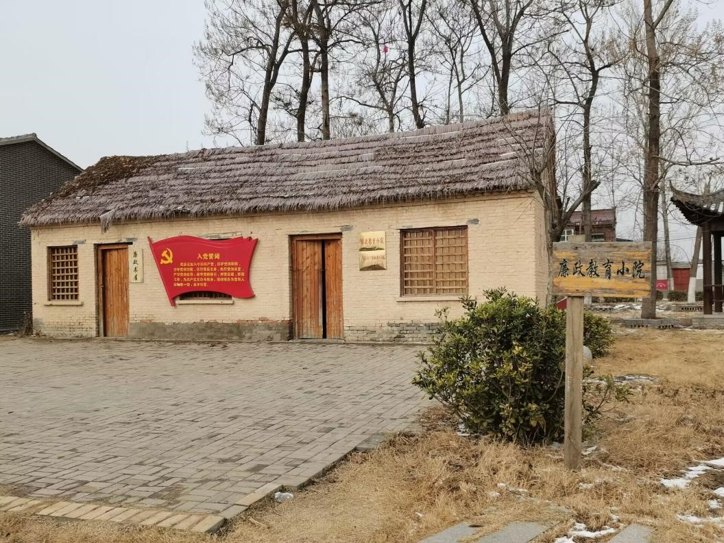 团队成员走出纪念馆,旁边是廉政教育小院,上面有入党誓词的红色旗帜,此处亦是宁陵县基层干部廉政教育基地。