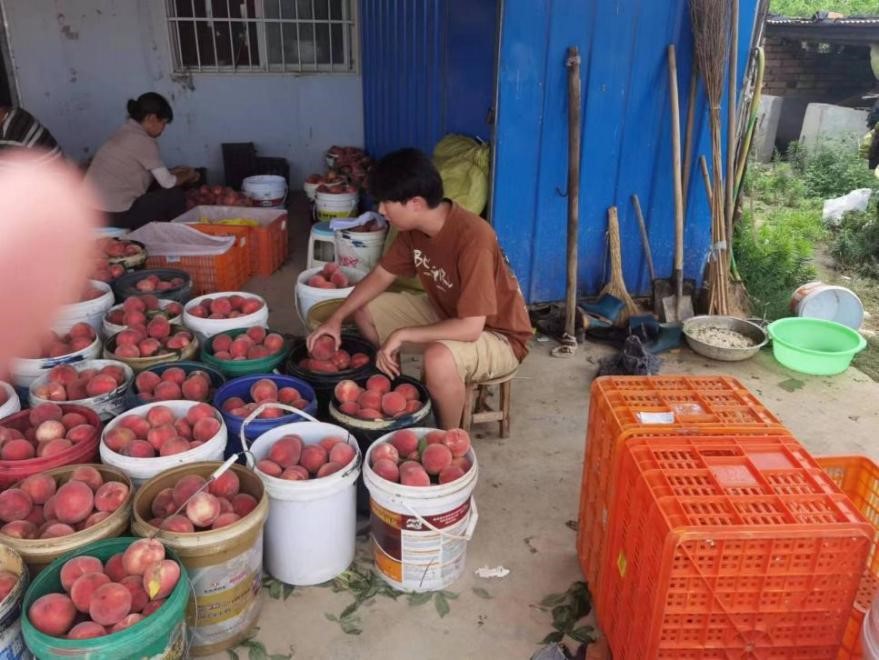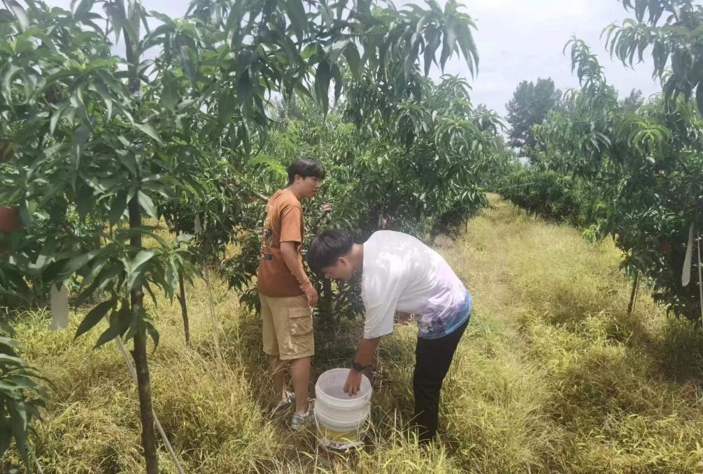小队参观了马山口镇村民的耕耘场景、了解了当地振兴企业的运营情况后,决定尝试投入到乡村劳动工作中寻求感悟。首先,小队成员参与了果农的摘桃工作。小队成员穿过桃林,用专业的摘果工具轻轻摘下成熟的桃子。这项工作需要细心和耐心,以确保采摘到完整且优质的桃子。果农们教会了成员如何选取最好的桃子,以及高效采摘的技巧。