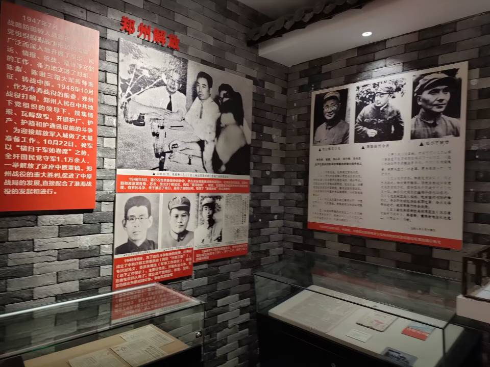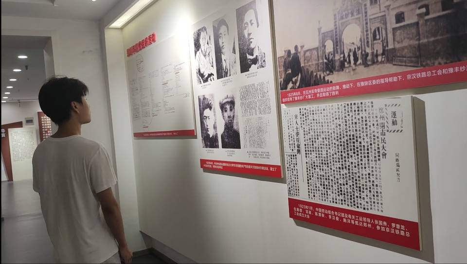 馆内以红色和黄色为主调,陈列了二七大罢工、南昌起义、中共一大等相关照片和介绍,将党的不懈奋斗的历程生动地展现在我们面前。1919年,“五四运动”的爆发打响了第一枪。次年春,李大钊、赵子健等一批共产党人先后来到郑州,通过举办工人夜校,启发工人觉悟,宣传马列主义,组织开展工人运动。1921年7月,党的一大召开后,郑州的工人运动进入了一个新的阶段。作为铁路交通枢纽的郑州,其时已成为全国工人运动的中心之一。1923年2月4日至7日,郑州党组织领导京汉铁路工人大罢工,反动军阀出动军警对罢工工人进行镇压,制造了震惊中外的“二七”惨案,工人运动虽曲折,但斗争活动从未停止,在中国工人运动史上谱写下了光辉篇章。1924年11月10日,国民革命军攻占郑州,我党及时利用这个时机,救出了“二七”惨案中被捕的工会领袖,随着铁路工人运动的重新兴起,党在郑州的组织建设也有了新的发展。1926年春,军阀吴佩孚占领郑州,于10月15日残酷杀害了京汉铁路郑州分工会委员长汪胜友、工务处工人总代表司文德,制造了骇人听闻的“郑州工人惨剧”,工人运动再次遭到挫折。1927年6月,冯玉祥立场发生右转,在河南公开实施“清党”,镇压革命运动。中共郑州市委停止活动,党员被迫转入地下,郑州革命运动暂时处于低潮。