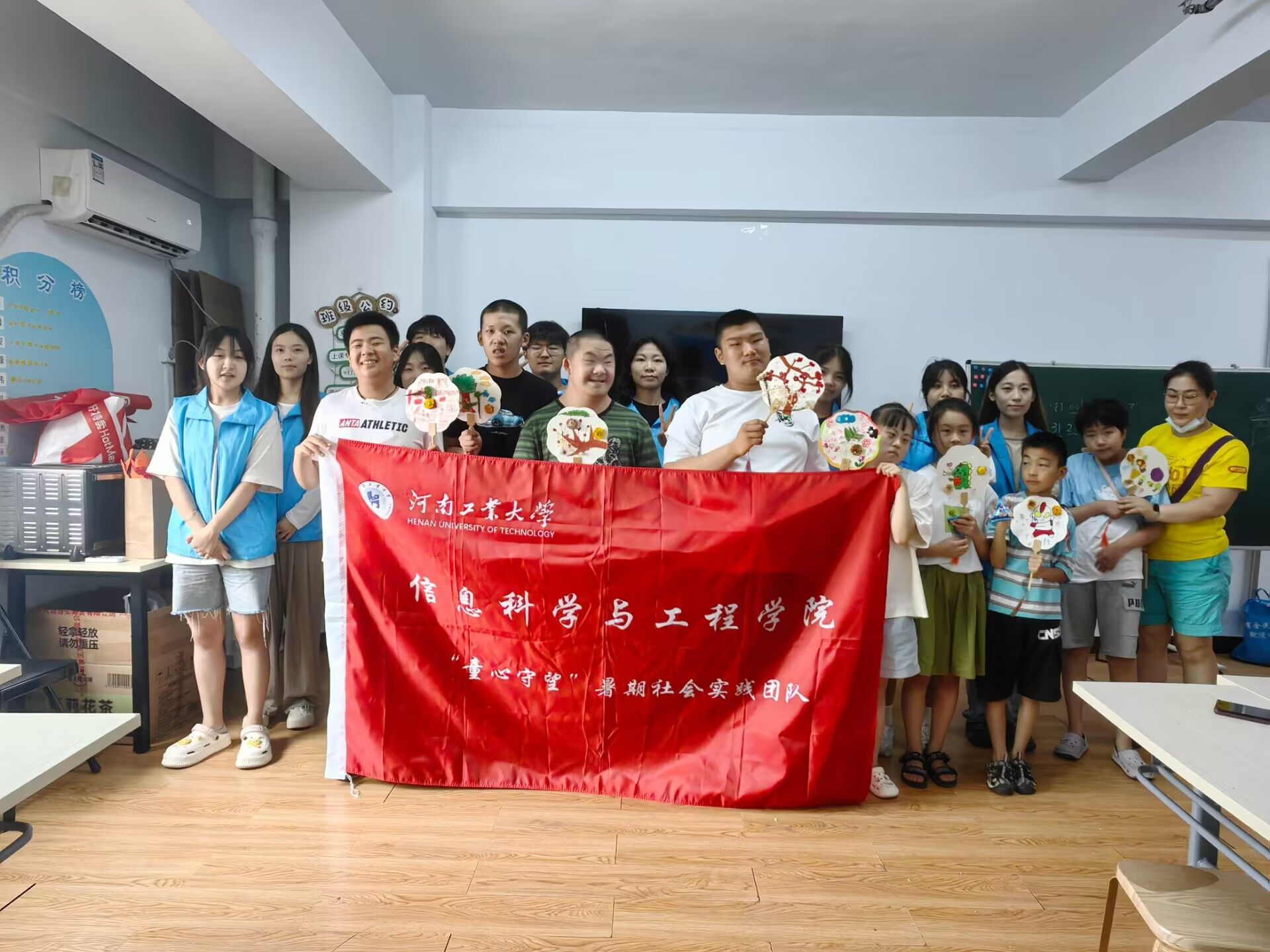 在这次活动的最后,志愿者和孩子们一同展示了完成的作品,每个孩子都富有创造力,活动圆满完成,实践团队的成员拿出院旗与孩子们合照。