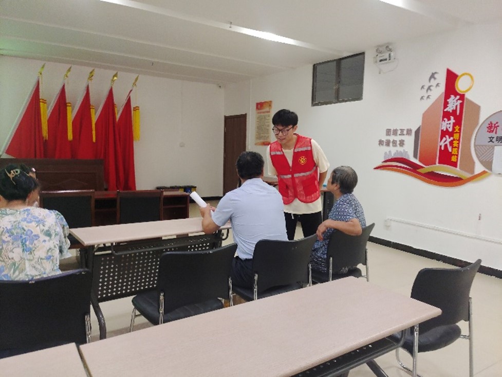 图2 贺家豪同学向社区老人了解社区消防情况,并提醒增强安全防范意识