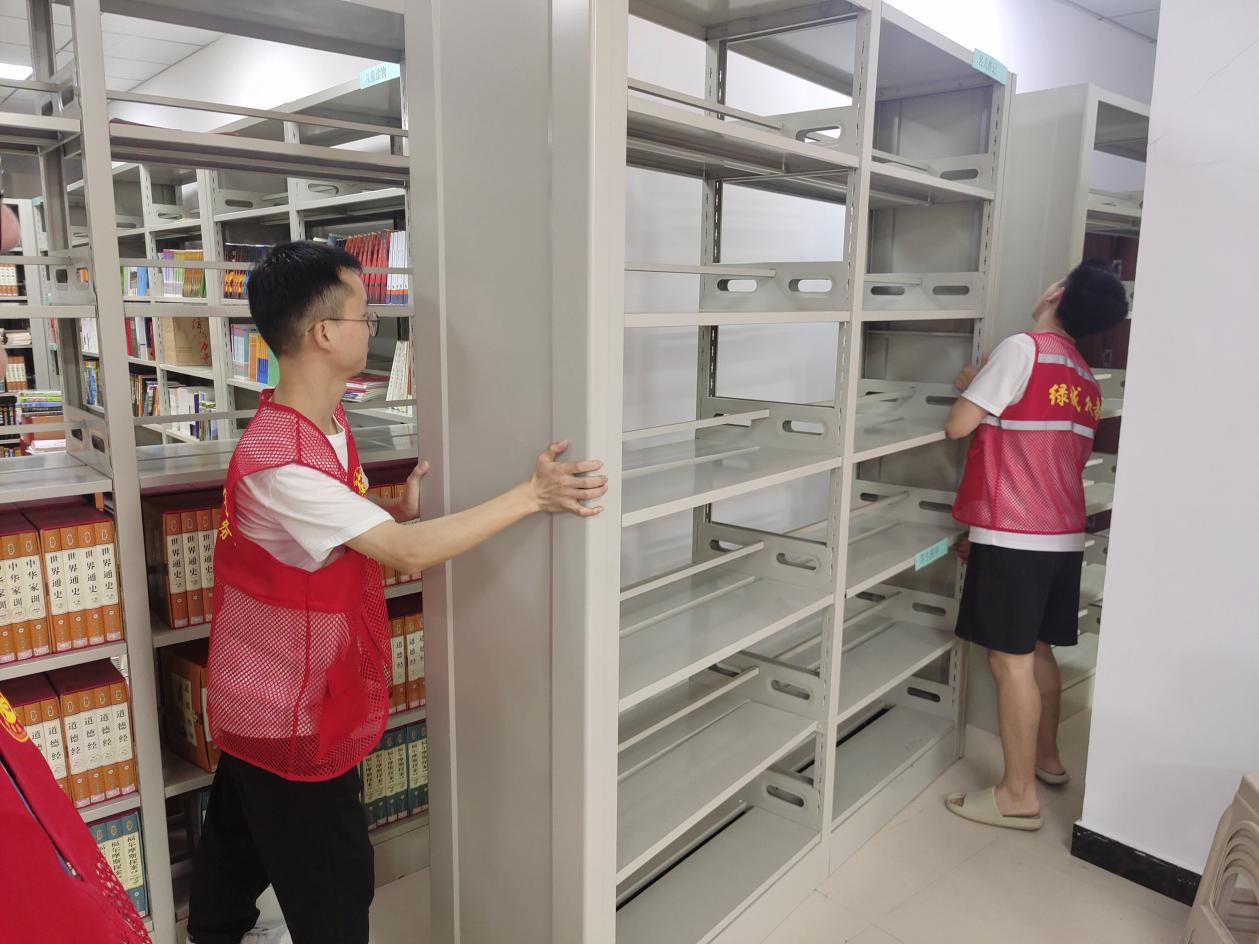 图4 崔华启、贺家豪、王峰基同学正在将整理后的图书归类摆放