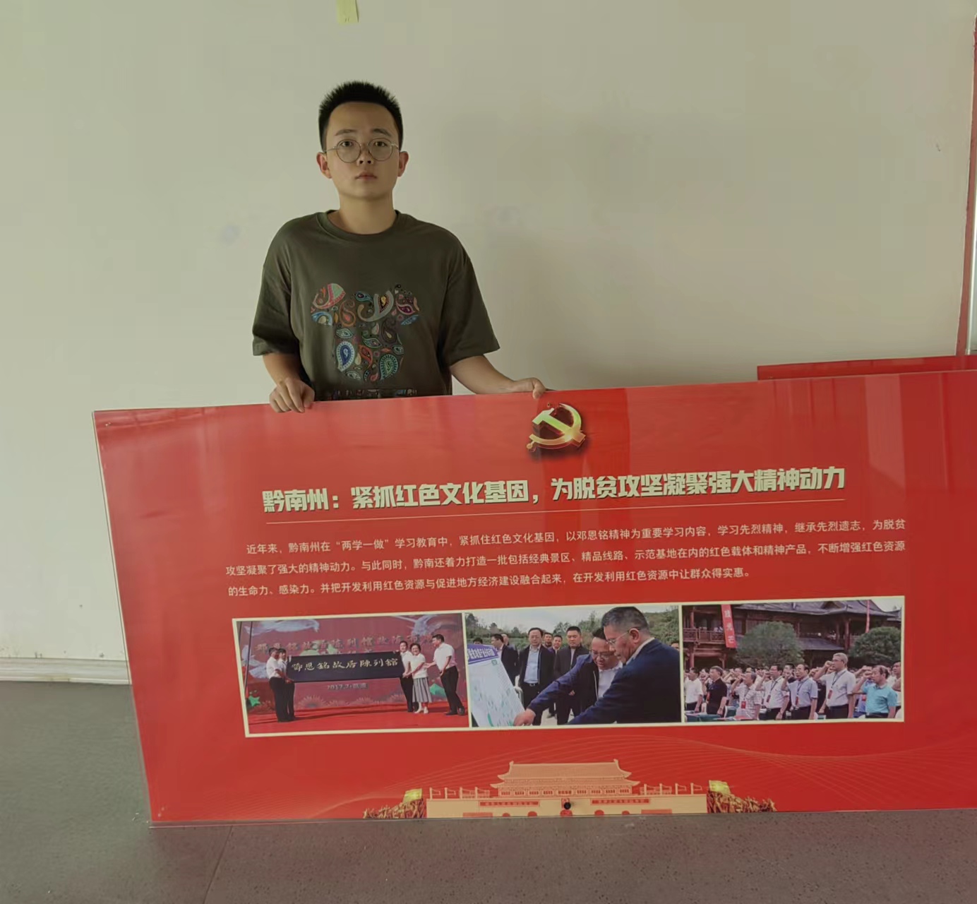 图三 团队成员崔翔在黔南州红色展馆与红色主题教育展示牌合照