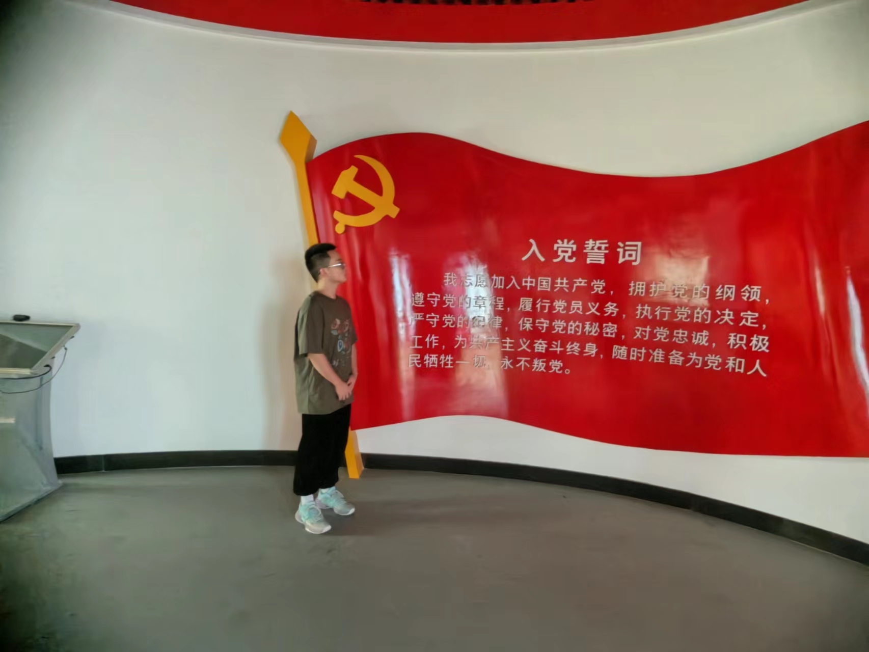 图五 小组成员崔翔在展馆内与“入党誓词”合照