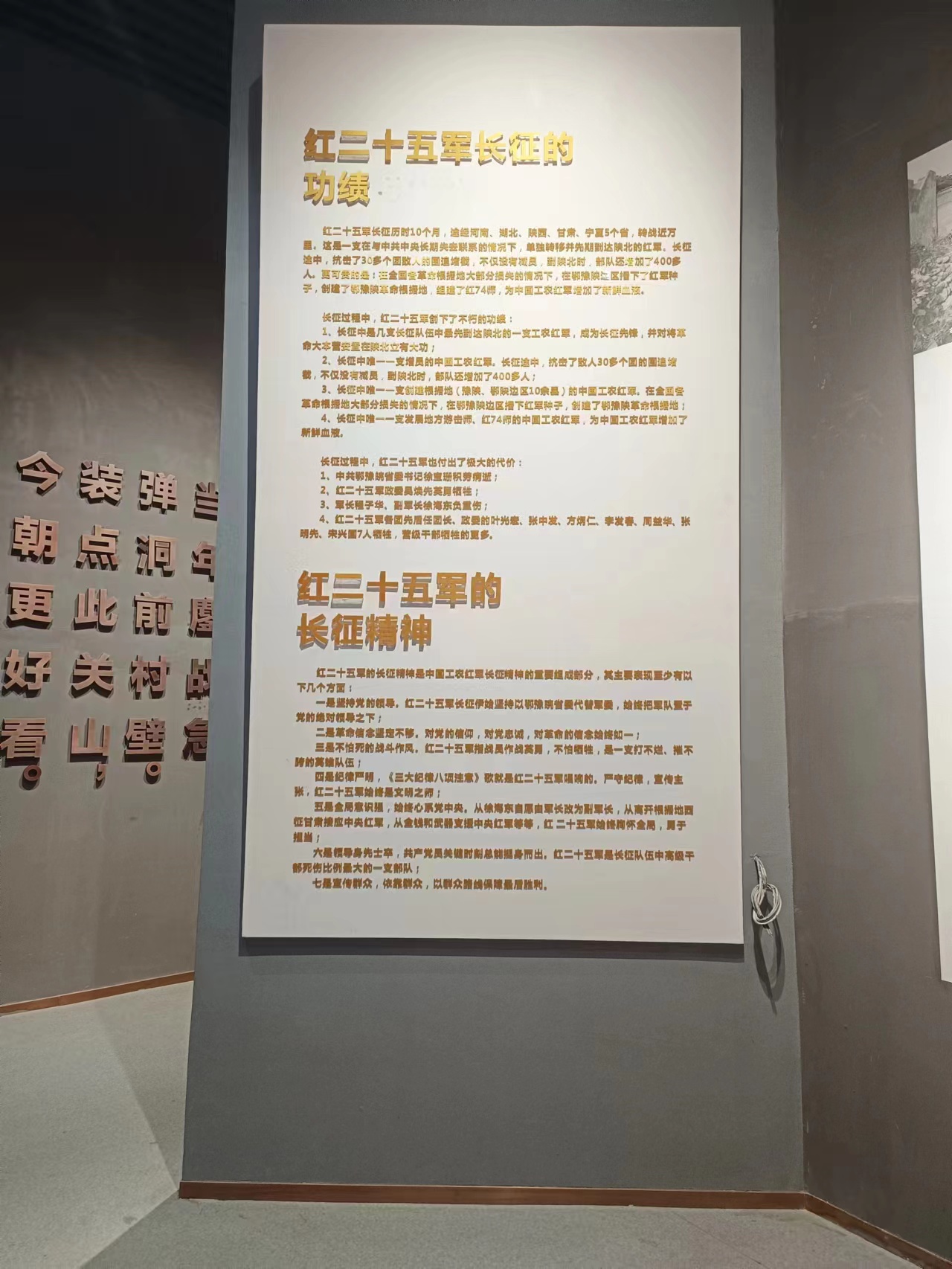 再往后,小队看到了红二十五军战斗中用的用具,看到了红二十五军长征的功绩和红二十五军的长征精神,还看到了毛主席的题词—当年鏖战急,弹洞前村壁。装点此关山,今朝更好看。小队对红二十五军的功绩感到敬佩,为红二十五军不怕死,不怕苦,身先士卒的精神而感动,对毛主席的诗而感慨万千。