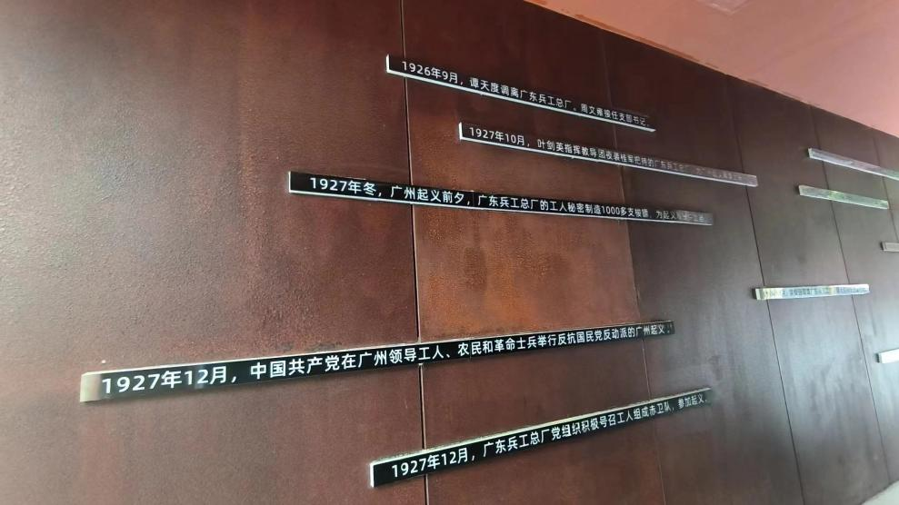 实践团队队员在教育基地就目睹了广东兵工厂的重要发展历程,大门一行行小字写出了广东兵工厂从1907年6月成立以来在新中国成立历程中的种种经历和转折。