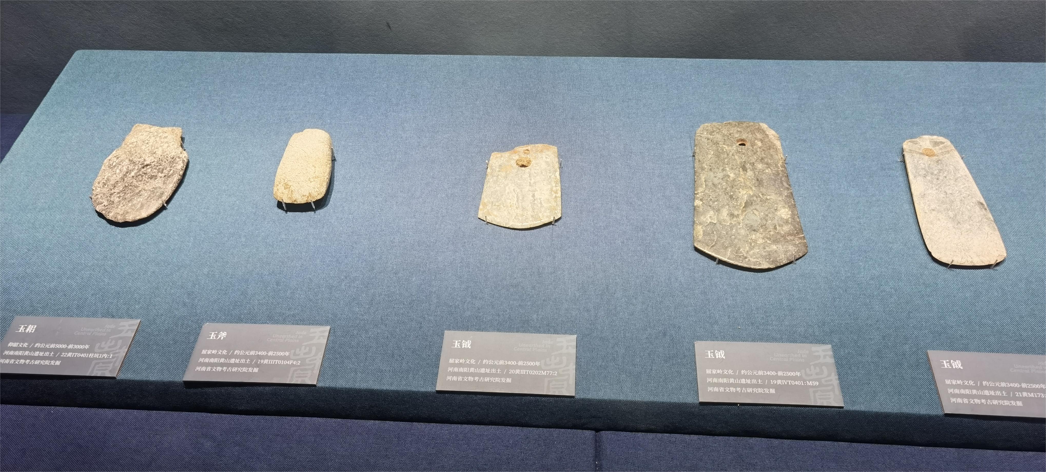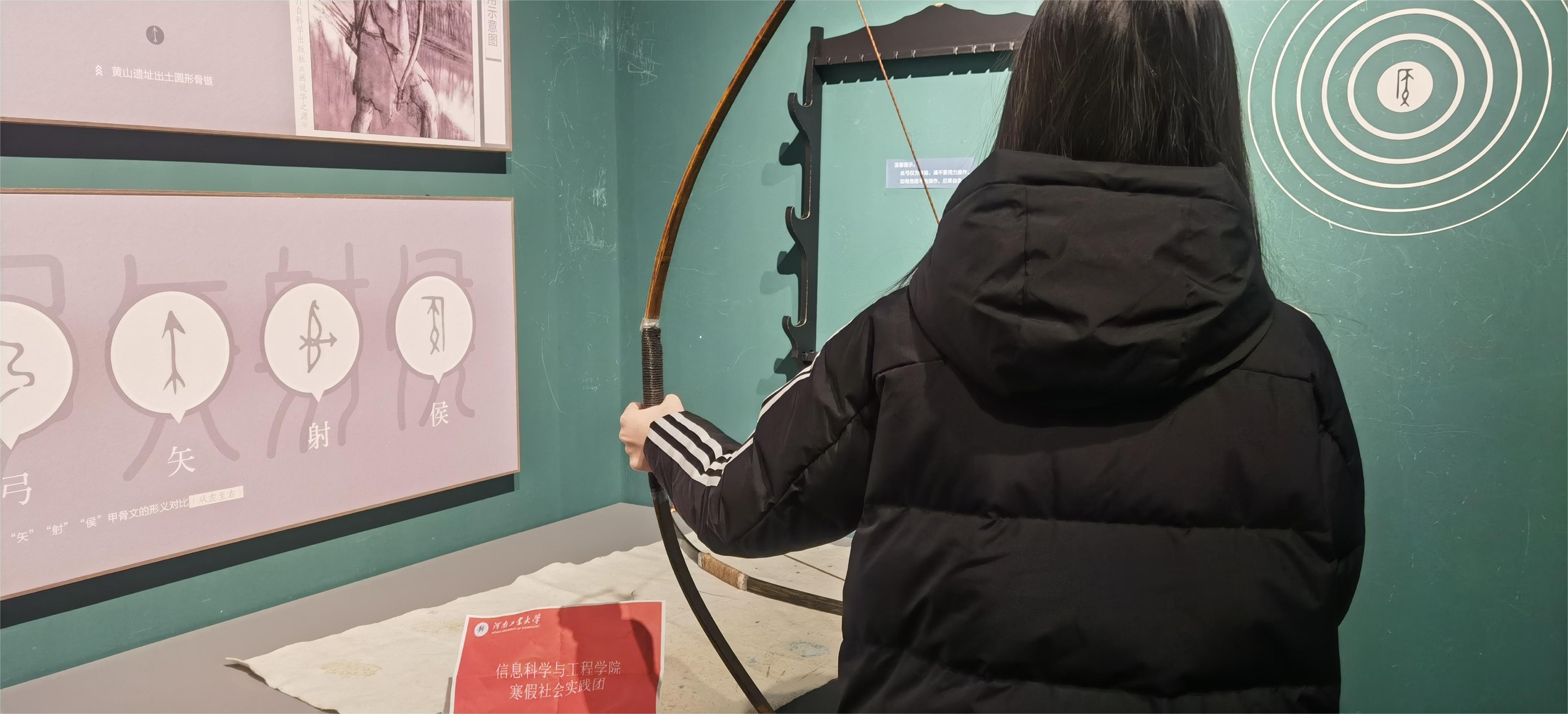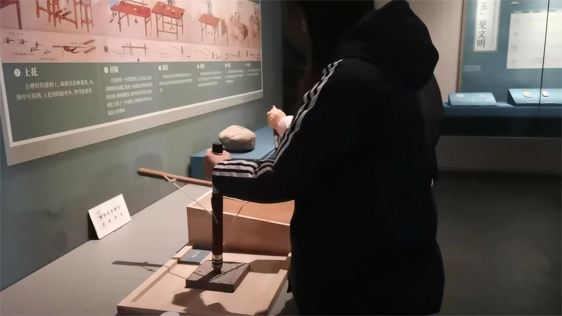 来到博物馆,小队的成员首先参观的是玉出中原展馆。在讲解员的带领下,小队成员了解到黄山遗址位于南阳市卧龙区蒲山镇,东临白河,北邻盛产汉白玉的丰山,西南则是中国四大名玉之一的独山玉产地——独山,优越的地理位置和丰富的自然资源造就了黄山遗址独特的文化内涵。小队成员在该展馆不仅欣赏到了许多黄山遗址中的玉器,还了解了黄山遗址的布局,包括使其能作为中原文化代表的原因。在学习古代玉器的加工过程中,还亲手体验了古人通过砣机、砣具等简单的工具经过开玉、扎碢、冲碢、磨碢、搯膛、打钻、上花等工艺制作出或精致、或简约大气的玉器件。