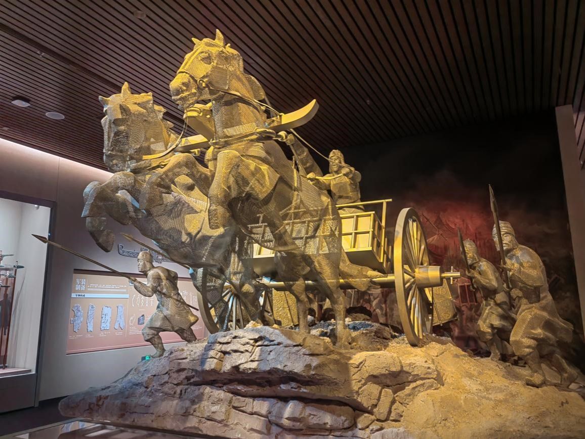 走进博物馆,团队成员首先来到了殷墟车马遗迹展厅。这个展厅仿佛是一个时光隧道,将人们带回到了三千多年前的殷商时代。展厅内,一辆辆保存完好的马车静静地陈列着,仿佛在诉说着那个时代的辉煌与荣耀。这辆马车造型精美,工艺精湛,充分展示了殷商时期高超的造车技术。车轮巨大,辐条整齐,车身装饰华丽,有的还刻有精美的图案和铭文。装饰华丽、结构轻巧、机动灵活的马车,展现着商王朝卓越的制造技术,是中国目前所见最早的马车实物标本,更是对三千多年前商文明的生动诠释。