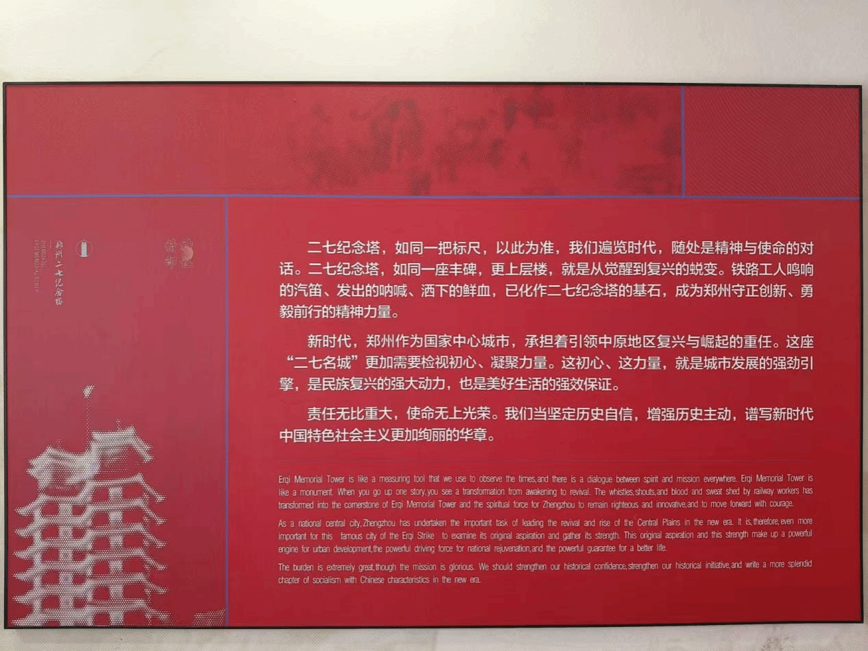 随后,团队来到二七纪念堂参观。二七纪念堂建筑座西面东,青砖垒砌,屋面红瓦覆盖,正中上方为堂徽,下是二七罢工铸铁浮雕。南楼为“二七史迹陈列馆”,北楼为“活动楼”。它由青砖垒砌,尖顶,红瓦屋面,是一座砖木结构的纪念性建筑。这是新中国最早的纪念性建筑之一。