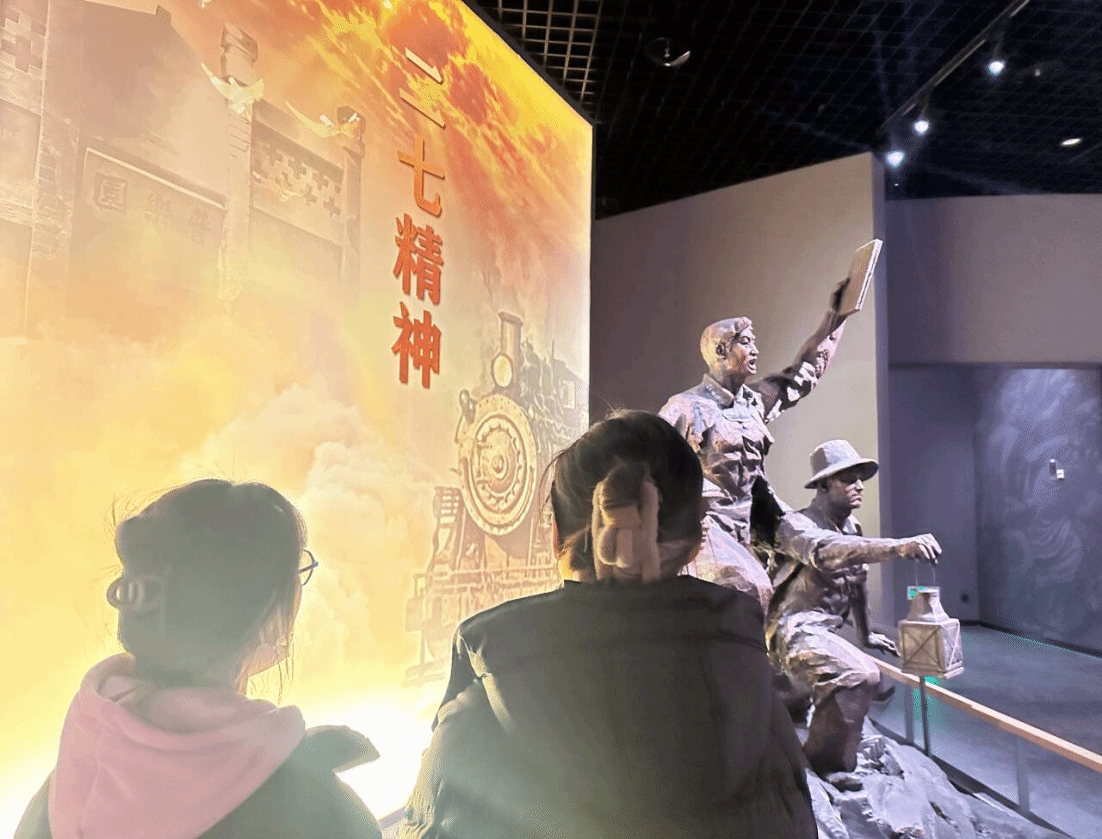 进入纪念堂,迎面而来的便是庄严肃穆的展厅。展厅内陈列着大量珍贵的文物、图片和展品,这些展品详细记录了二七大罢工的起因、经过和结果。通过讲解员的生动讲解,成员们了解到,当年工人们在极其艰苦的条件下,为争取基本的生存权利和政治权利,进行了英勇的斗争。展品中既有当年工人们使用过的工具、穿过的衣物,还有他们在斗争中使用的旗帜和标语,这些真实的物件仿佛将大家带回到了那个战火纷飞的年代。不同的文物排列在面前,不仅仅是革命的文物,更是革命人们的精神代表,革命精神深深打动人心,那勇往直前,不惧苦难的二七大罢工精神深深地感染了队员,队员内心不由地发出尊敬之情。