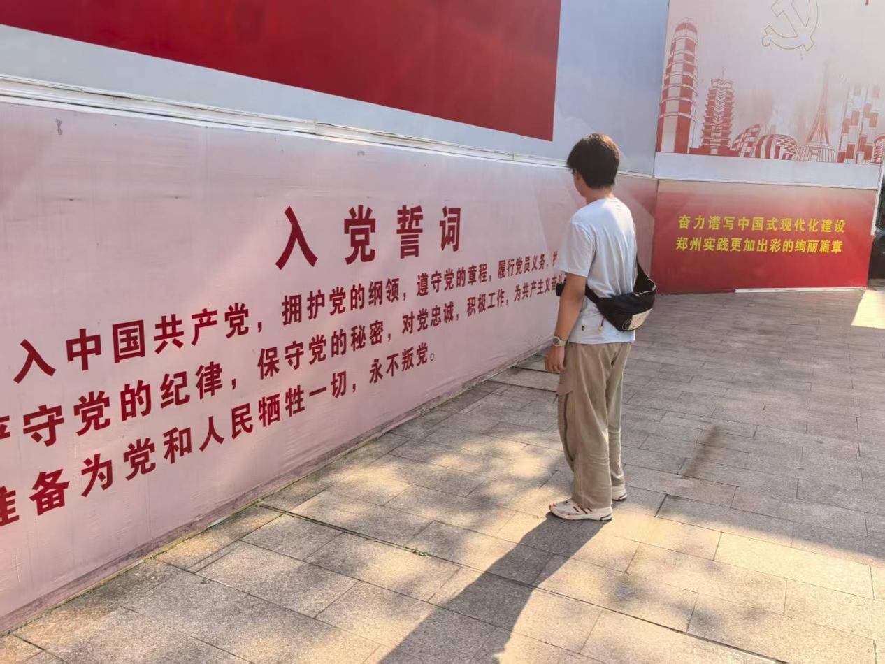队员们围绕党建宣传展板驻足学习,当目光聚焦入党誓词时,潘祖明同学伫立凝视,认真研读誓词内容。“我志愿加入中国共产党……随时准备为党和人民牺牲一切,永不叛党”,庄严的誓词,既是共产党人的行动指南,也让现场青年深刻感受到信仰的力量与使命的分量。大家结合“奋力谱写中国式现代化建设郑州实践更加出彩的绚丽篇章”的目标,交流新时代青年如何将个人成长融入党和国家发展大局,以青春之我践行使命担当。
