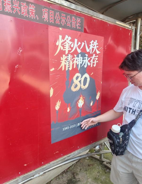 为纪念抗战胜利80周年,7月5日上午8时30分,实践团队围绕“传承红色精神”的主题,在村内开展红色文化宣传活动。团队成员精心制作图文并茂的宣传展板,用通俗易懂的方式向村民传播红色文化知识,弘扬爱国主义精神,营造浓厚的红色教育氛围。此次活动不仅增强了村民的历史认同感,也使青年学子在讲述与传播中进一步坚定理想信念。