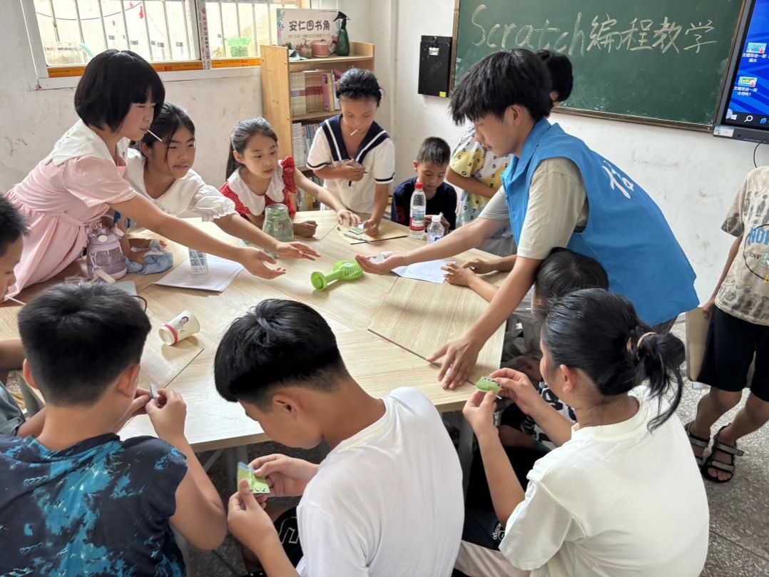 下午3时许,冠军小学的学生们陆续到校。考虑到天气炎热,团队提前准备了清凉贴和饮用水(图三)。起初学生较为腼腆,队员们便以抽签形式将学生分成小组。教学开始后,团队成员耐心引导学生熟悉编程环境,却发现部分学生因首次接触电脑,存在找不到鼠标指针等问题。针对这一情况,成员们先从鼠标使用及基础键位教学入手,再逐步推进编程内容。