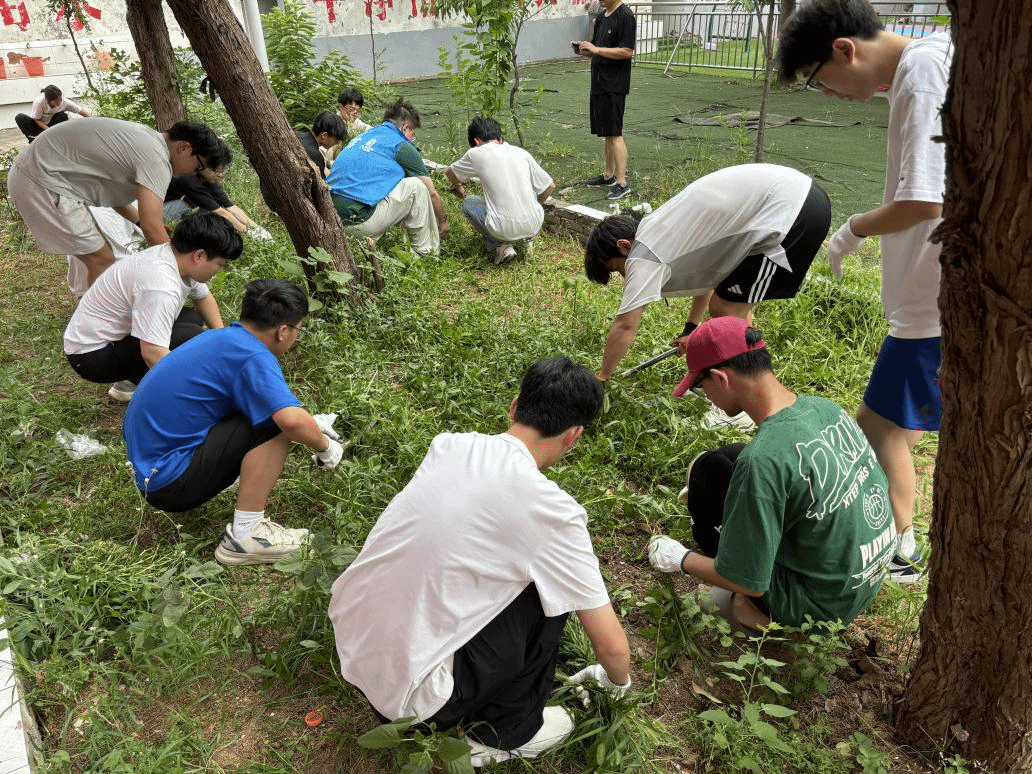 当日上午6时,团队成员在村委信息员海蕊老师、驻村书记常德海老师的带领下,前往冠军小学教学楼后的花坛开展除草劳动(图一)。常老师为此前得知活动,主动要求参与其中。劳动时,老师细致指导队员识别有益草种,确保除草时予以保留。期间雨滴悄然落下,大家并未停歇,在雨中相互配合、团结协作,高效完成了杂草清理工作。这场雨中劳作不仅美化了校园环境,更锤炼了团队的协作精神与实干品质。