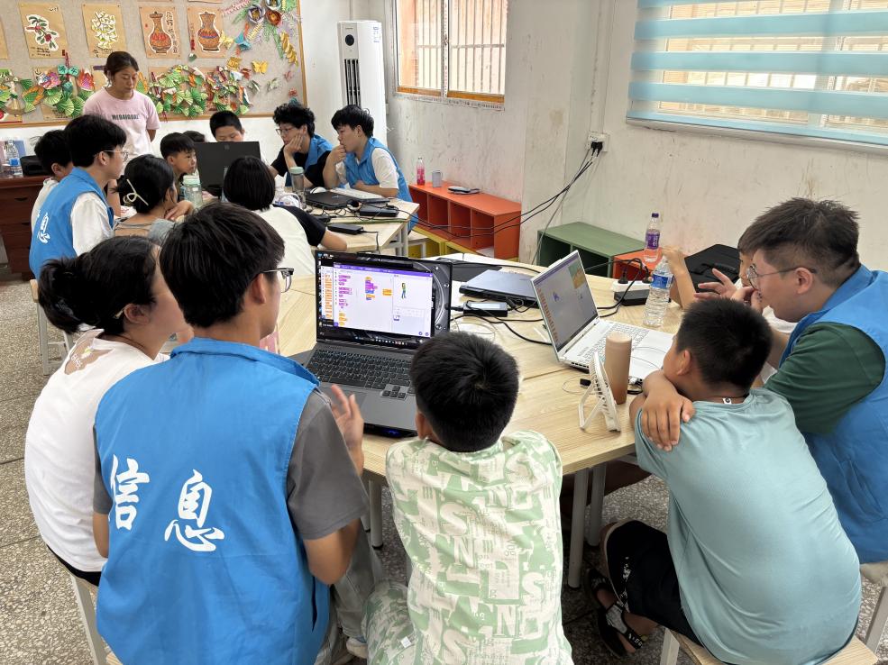 下午,团队按计划开展编程支教活动(图二)。尽管前一日气温高达41摄氏度,但今日学生们仍热情不减,更有新同学加入。针对当日难度有所提升的教学内容,队员们耐心讲解,尤其在代码教学中,根据学生接受情况调整节奏。看到学生专注的神情,队员们教学热情愈发高涨。17时许,队员们还与学生共同拍摄短视频,丰富了课余生活,拉近了彼此距离。