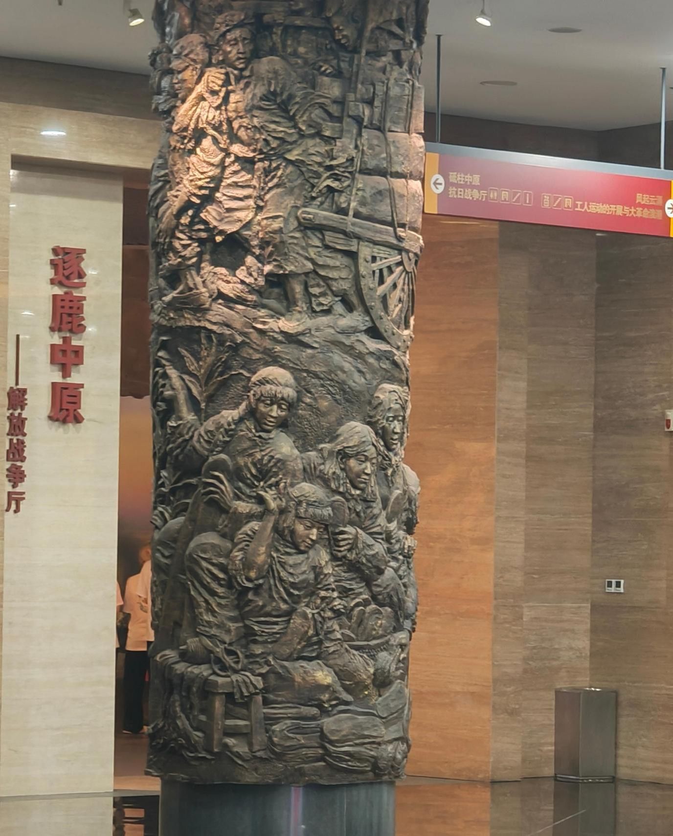 重点调研聚焦 “中原鏖战” 展厅沉浸式展陈。解放战争时期粟裕兵团作战命令电文、淮海战役支前民工独轮车等文物,与 “鏖战大别山” 全景油画形成史料互证。馆内 12 根高 6 米汉白玉浮雕柱引发关注,其以 “二七风暴”“竹沟烽火”“中原突围” 等事件为题材,浓缩 1919 至 1949 年革命史诗。