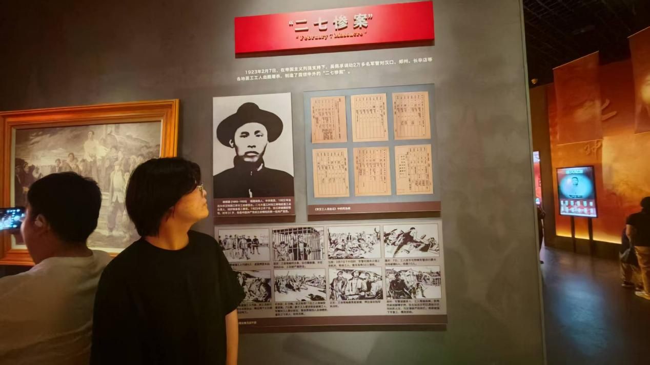 8月27日上午,实践团队来到了毗邻纪念塔的二七纪念堂进行深入研学。相较于纪念塔的象征意义,纪念堂内的展览更为系统、详尽。丰富的史料、逼真的场景复原、多媒体技术的运用,全方位、多角度地还原了京汉铁路工人大罢工从发起、发展到遭受镇压、最终取得历史性胜利的全过程。同学们通过观看历史纪录片、阅读文献档案、参与互动体验,对这场中国工人运动史上规模最大、影响最深远的斗争之一有了更为全面和深入的了解。它不仅是一场争取经济权益的斗争,更是一次反帝反封建的政治觉醒,充分展现了中国工人阶级强大的组织力量和彻底的革命精神。