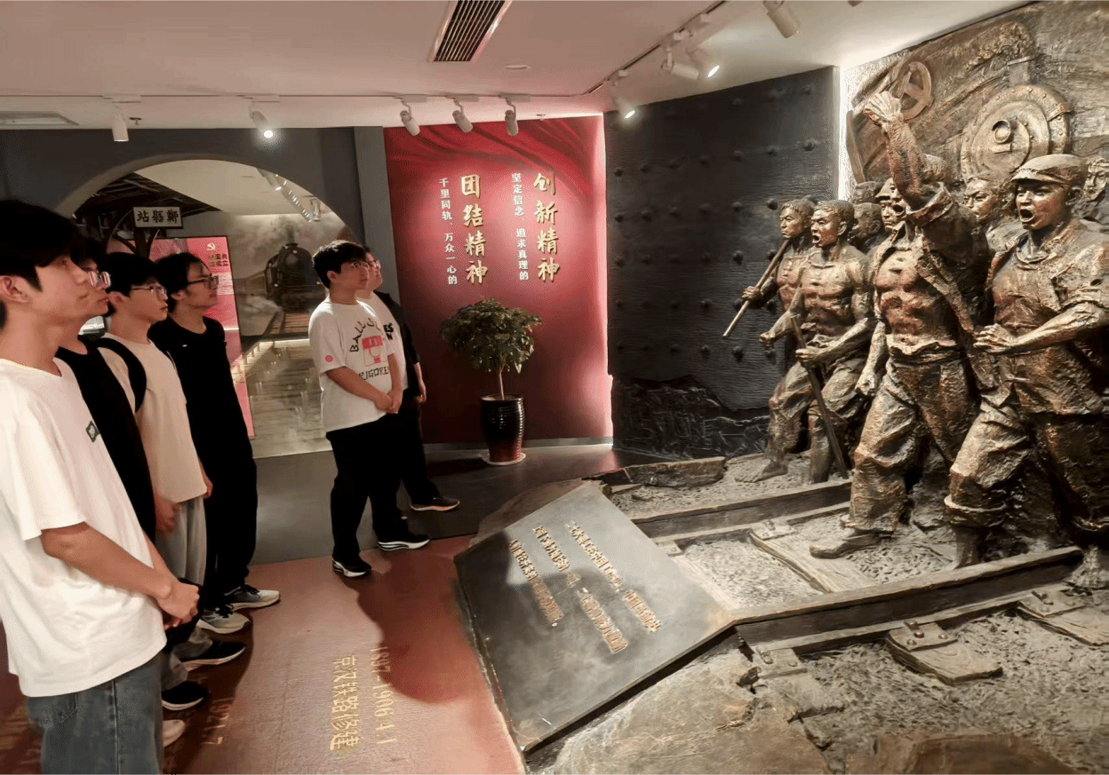 8月27日上午,调研小队首站来到二七纪念堂。在纪念堂工作人员的引导下,小队成员参观了馆内陈列的二七大罢工历史史料、实物展品及影像资料,系统了解1923年二七大罢工的历史背景、斗争过程与重要意义,直观感受革命先辈为争取工人权益、追求民族解放所展现的坚定信念与无畏精神。工作人员结合展品细节,向小队成员讲解了罢工期间工人代表的英勇事迹,让成员们对“二七精神”的内涵有了初步认知。