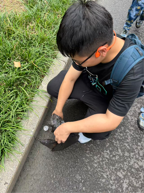 (图四是谢子豪在捡取行人丢弃的垃圾)