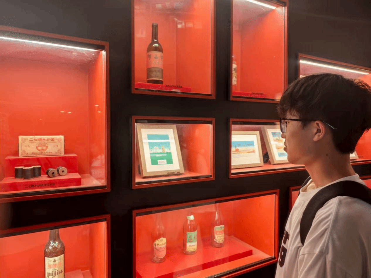 在“纪录”展厅,队员们见到了许多上世纪的老物件。例如搪瓷器、邮票、老二七塔参观券、曾经郑州产出的烟酒副食等展品。如图二所示为队员吕亚宸在观赏老物件。
