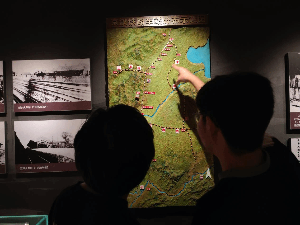 在三个展厅中,其中的一张“京汉铁路车站分布示意图”吸引了队员的注意。如图三所示,队员彭鹏朋(左)与孙耀星驻足在“京汉铁路车站分布示意图”前,仔细地审视了铁路车站的分布状况,讨论铁路所覆盖的范围,推测铁路对各行业发展的影响。