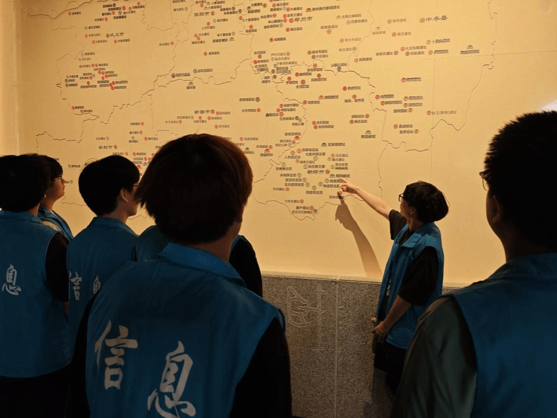 展厅中央的黄河文化遗址地图前,灯光下,裴李岗遗址星点、仰韶彩陶纹样、龙山黑陶遗址连片标记清晰可见。团队宣传专员化身临时讲解员,指尖落向豫地标记:“八千年前裴李岗,石磨盘叩响农耕序章;仰韶彩陶漫染大河村太阳纹,是先民对天地的诗画;龙山黑陶映着西山古城墙,见证文明向‘豫’地凝结。” 讲解随指尖游走,队友与游客屏息聆听,地图星点化作黄河文明涌流的脉络。