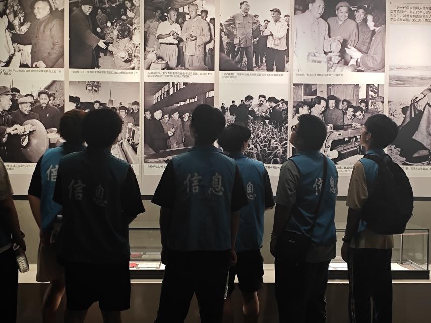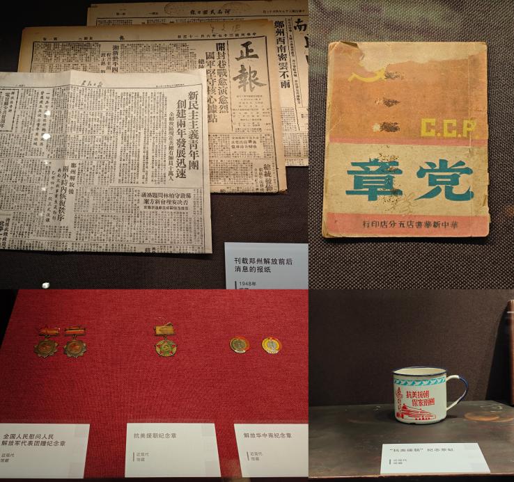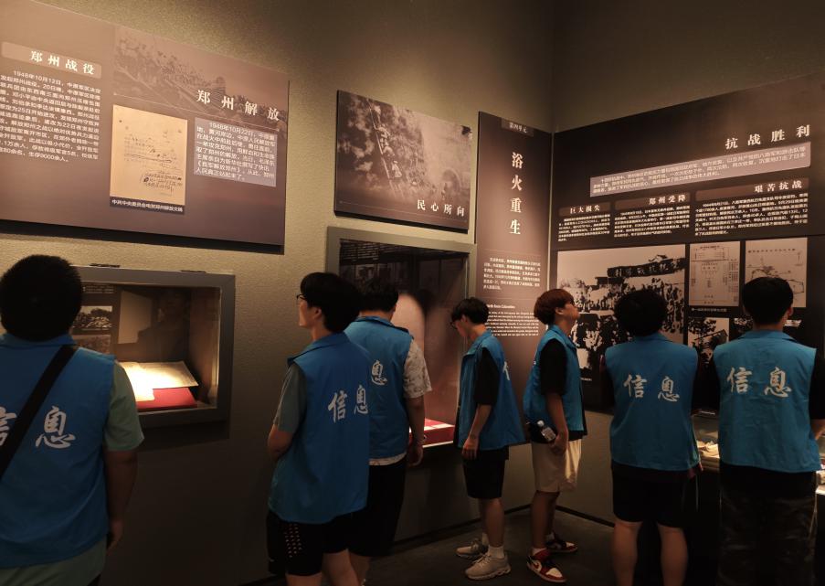 沉郁光线漫过 “郑州战役”“抗战胜利” 的展墙。队员们围拢展柜 —— 泛黄报纸上 “郑州解放” 的油墨洇着旧年潮气,1948 年的报角卷成时光褶皱;磨损的党章封皮,隐现地下工作者的掌心温度;抗美援朝搪瓷杯红漆虽褪,“保家卫国” 仍灼灼发亮。有人指尖悬在玻璃上,似触到炮火与炊烟的交界:从商代夯土到红色征程郑州的脉搏,始终在抗争里跳得滚烫。