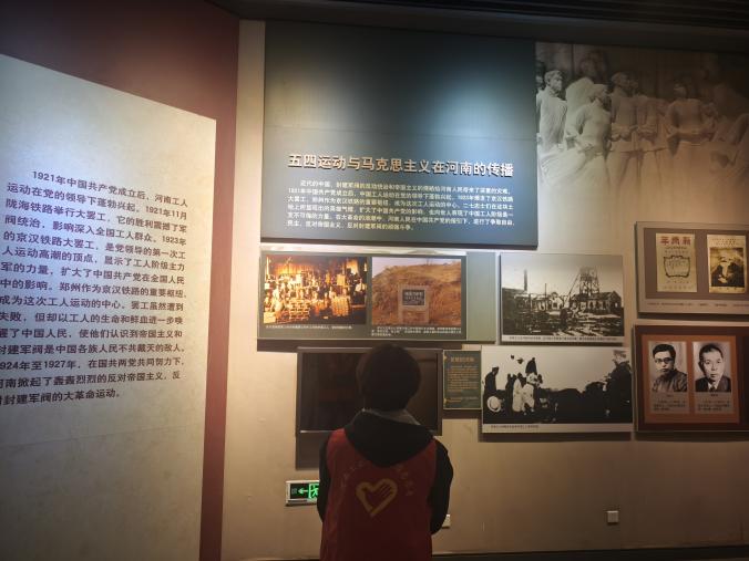 进入展陈区域后,队长唐思恩带领队员们首先在工人运动与大革命相关展区驻足,围绕展板上的史料图片与文字说明进行对照记录,重点梳理早期群众运动在河南的传播路径与时代背景。随后在五四运动与马克思主义传播相关内容前,队员们分组摘记关键时间线与代表性事件,并将展陈中涉及的地名与人物线索逐条核对,力求把参观从走马观花变成带着问题去思考的主观性学习。