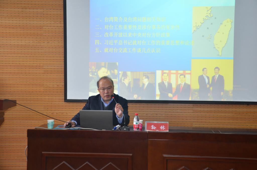 接下来,孙林详细介绍了中国台湾的地理历史、政治军事、社会结构、发展现状,阐述了对台工作的重要性及涉台事务的复杂性;他结合党史讲述了两岸关系发展历程,剖析了台湾问题根源,深刻阐释了习近平总书记关于对台工作的重要思想,强调了对台交流工作中应遵循的基本原则和注意事项。他表示我校目前是河南省内赴台交流学生人数最多的高校,为豫台交流做出了贡献,省台办会继续支持学院与台湾开展各种形式的合作。